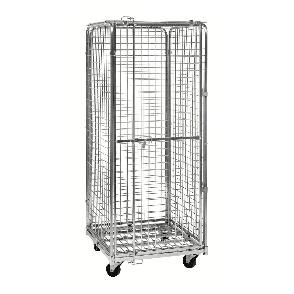 Diebstahlsicherer Gitterschrank aus verzinktem Stahl, ausgestattet mit 2 Türen, die mit einem Vorhängeschloss (nicht im Lieferumfang enthalten) verschlossen werden können, und 4 Rädern mit einem Durchmesser von 100 mm (2 feststehend + 2 schwenkbar). Gitter-Maschenweite 5×5 cm. Maximales Ladegewicht: 400 kg.