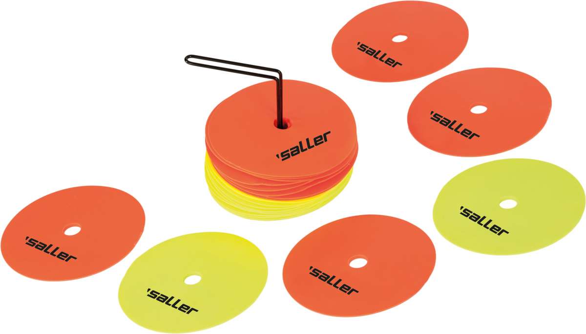 Unser hochwertiges 24er Saller Markierungsteller System in Signalfarben ist aus flexiblem, langlebigem Kunststoff und somit sehr belastbar. Die Markierungsteller bieten sich ideal an um Spiel- und Laufbereiche abzugrenzen oder Geschicklichkeitsübungen zu absolvieren. Ein praktischer Metallhalter sorgt weiter für eine platzsparende und ordentliche Aufbewahrung.