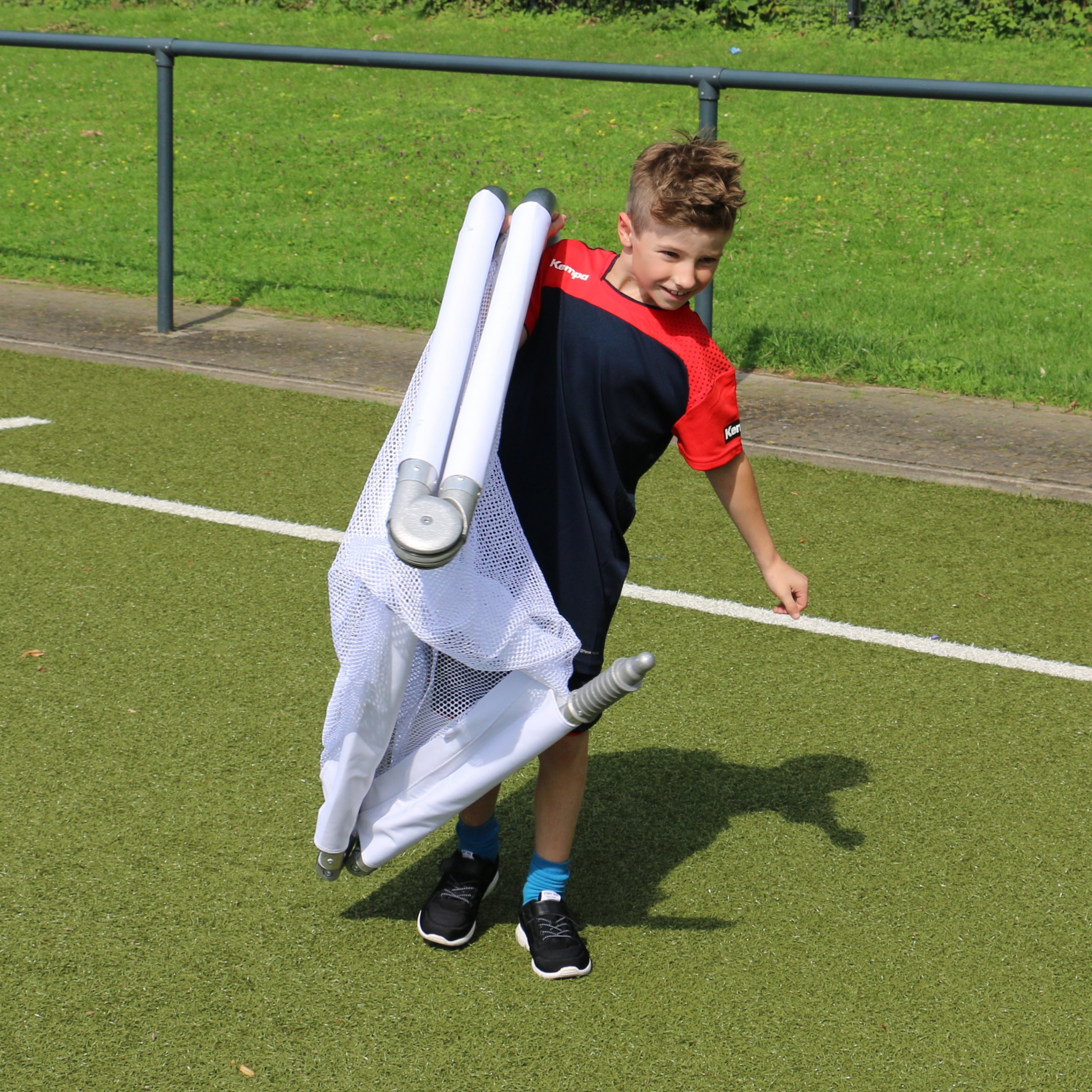 Das Tor zeichnet sich durch seine Stabilität, Leichtigkeit und Tragbarkeit aus. Der Torrahmen besteht aus robustem Aluminium in einem blanken Rundprofil, das eine lange Lebensdauer gewährleistet. Die Netzbügel sind einklappbar, was das Tor besonders platzsparend und einfach zu transportieren macht.
