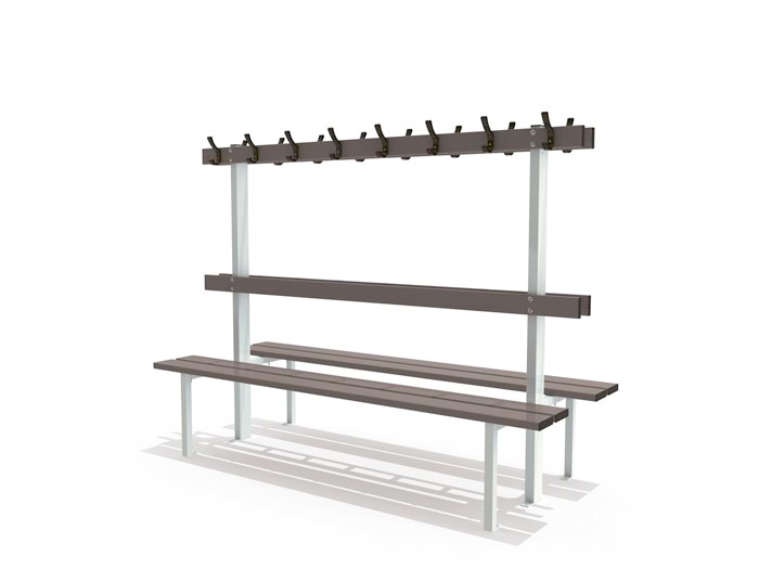 Am Boden zu befestigende, doppelseitige Umkleidekabinen-Mittelbank mit Rückenlehnen und Kleiderhaken. Es handelt sich um eine weiß kunststoffbeschichtete Stahlrohrgestell mit Sitzen, Rückenlehnen und Kleiderhaken aus kunststoffbeschichtetem, verstärktem Aluminium oder auch in Holz (Iroko oder autoklaviertes Nordkiefernholz) erhältlich.