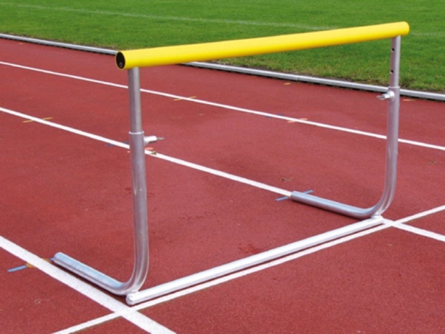 Schulsporthürde aus Aluminium mit einer Hürdenleiste aus gelbem Kunststoff (PVC). Standardhöhen: 0,840 m – 0,762 m – 0,685 m – 0,600 m.